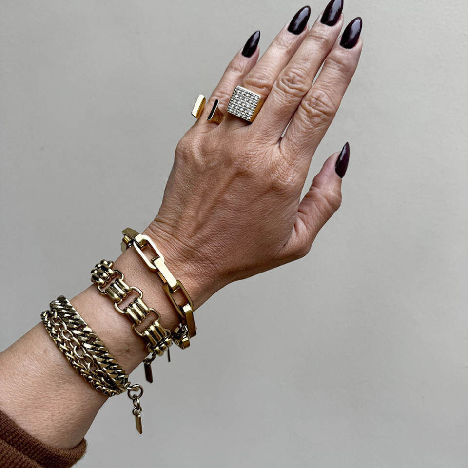 אני עונדת צמיד לולאות שטוחות מלבני רחב בגוון שחור