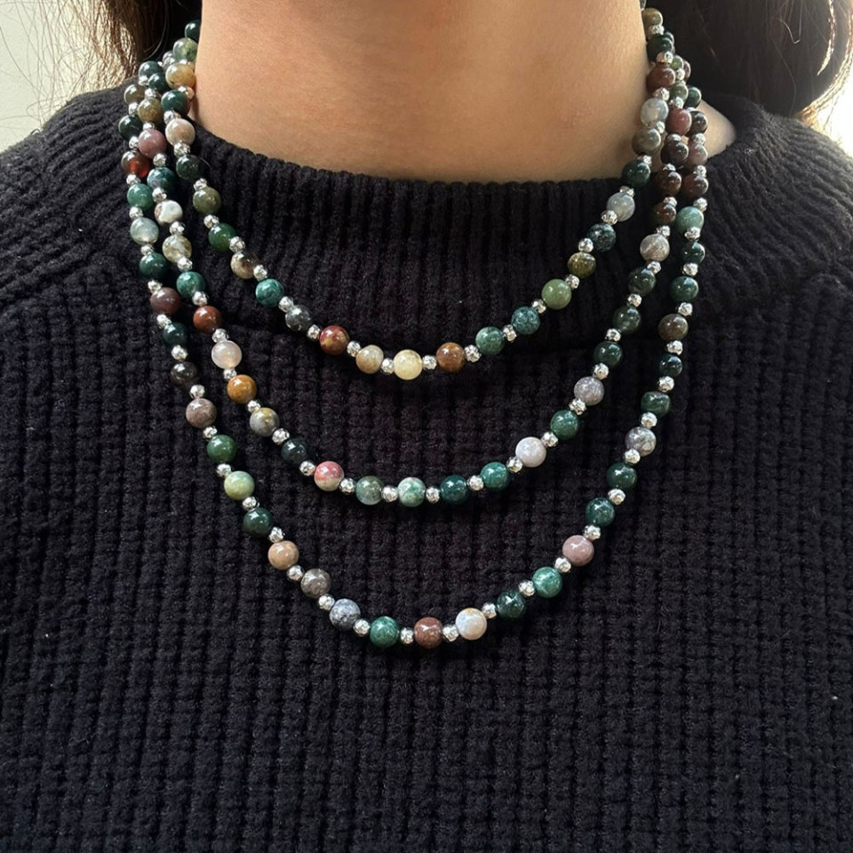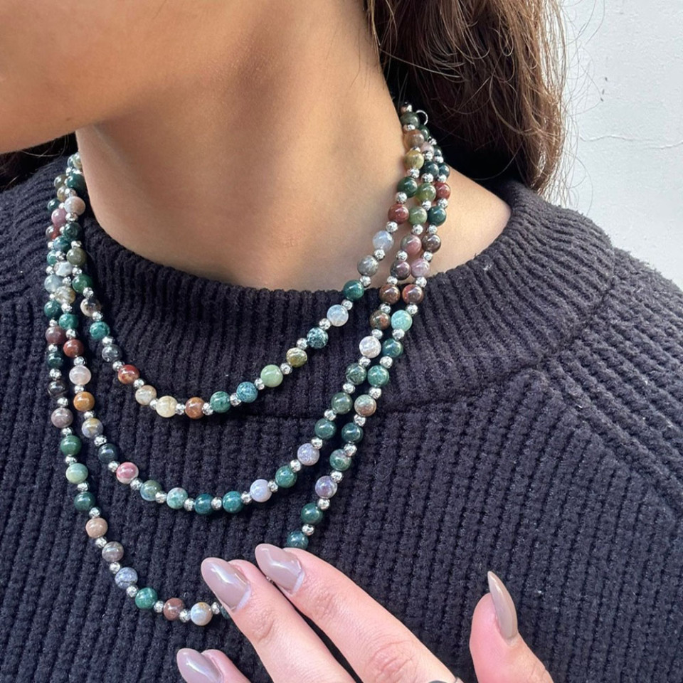 נויה עונדת 3 שרשראות אבני אגת בגוונים ירוקים וחומים