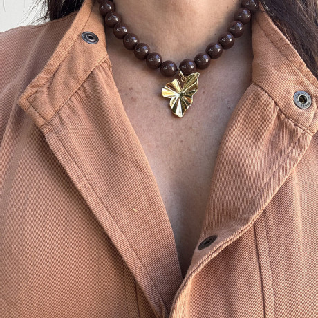 אני עונדת את השרשרת חרוזי שוקולד עם התליון לב מניפה