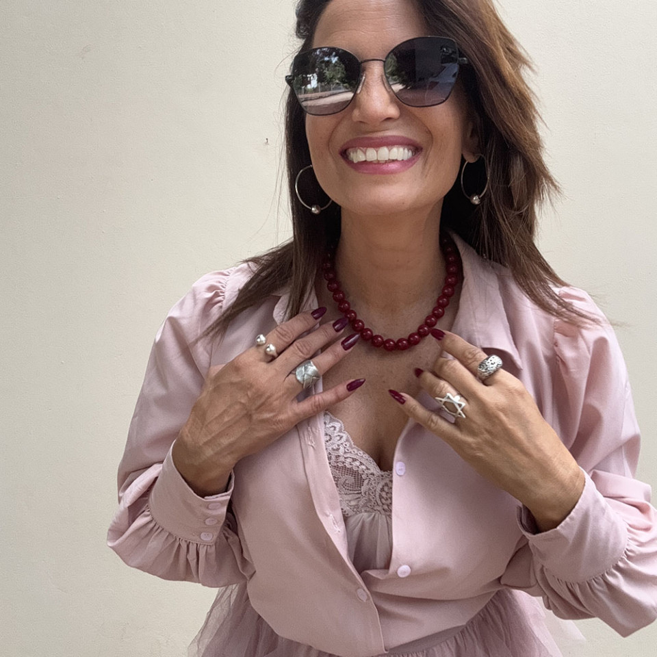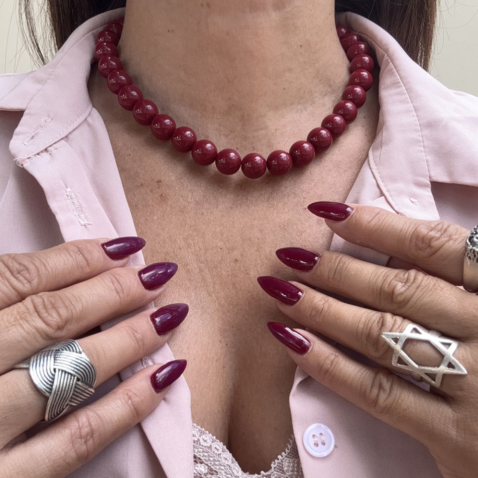 אני עונדת שרשרת חרוזי אקריל בגוון בורדו בקוטר 12 מ"מ