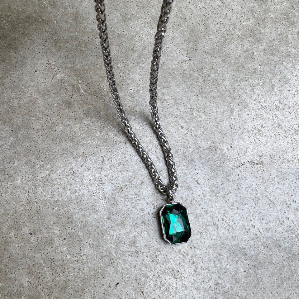 שרשרת קלועה בגוון כסוף עמיד במים תליון מלבני ירוק