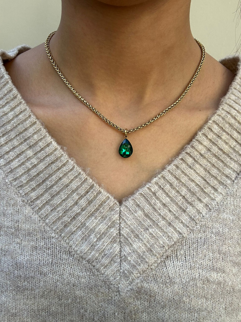 שרשרת קלועה עבה עם קריסטל ירוק בצורת טיפה בציפוי זהב