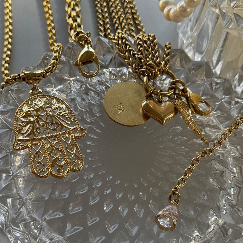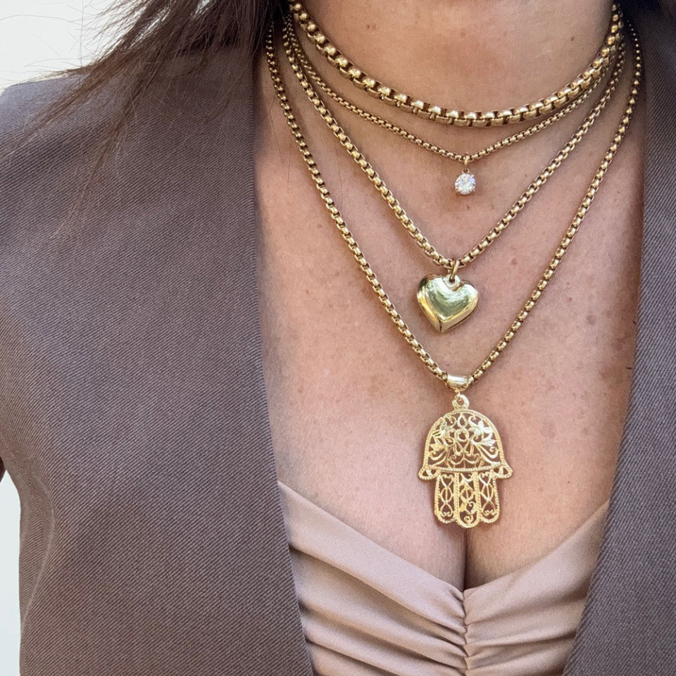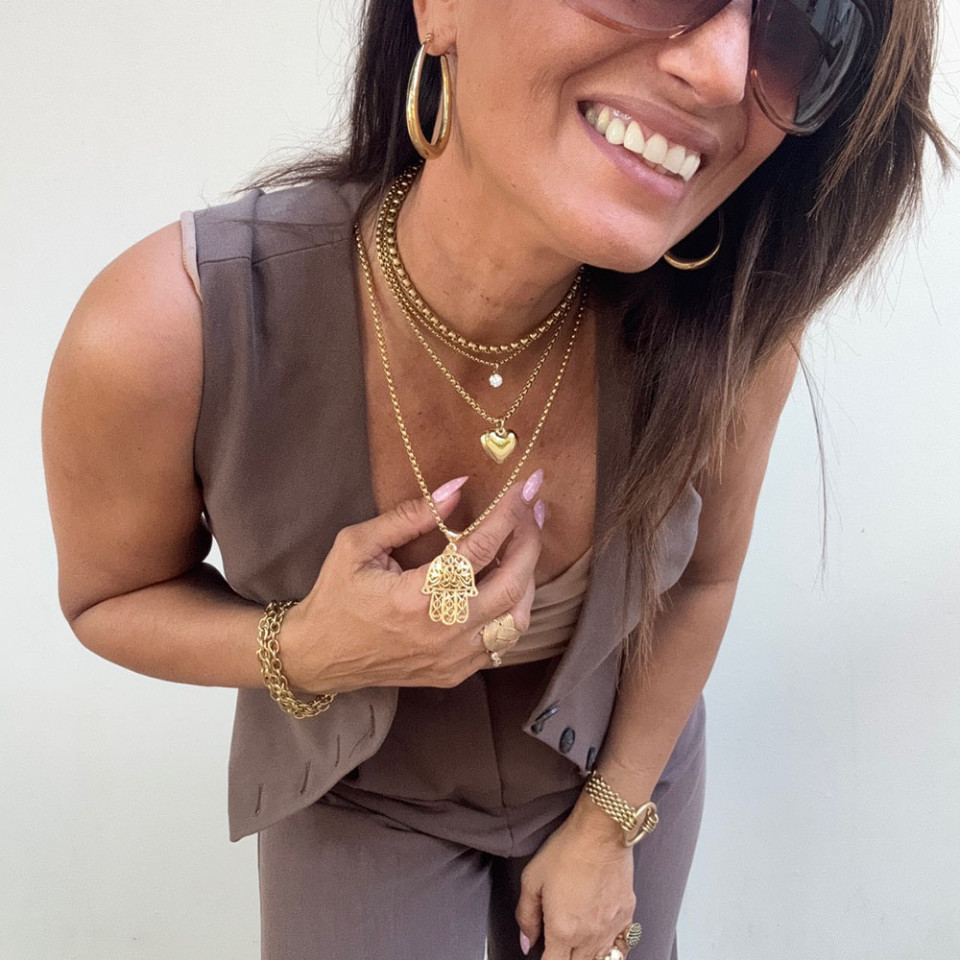 אני עונדת שרשרת חמסה ענקית בגוון זהב אורך 36 ס"מ