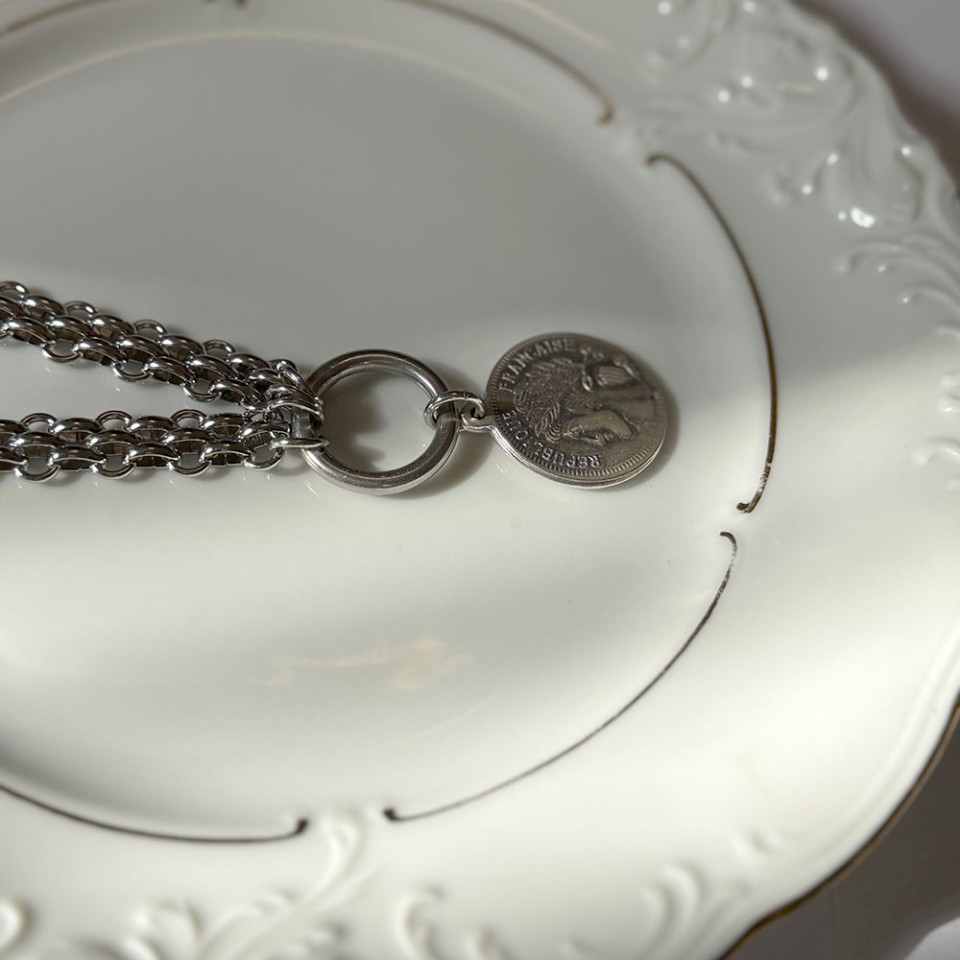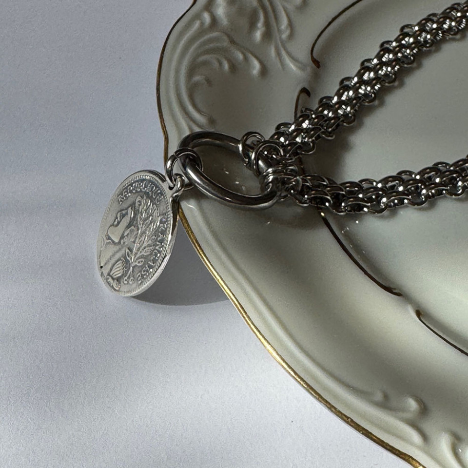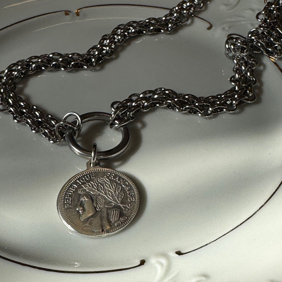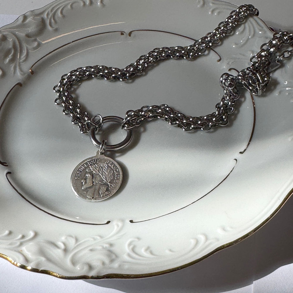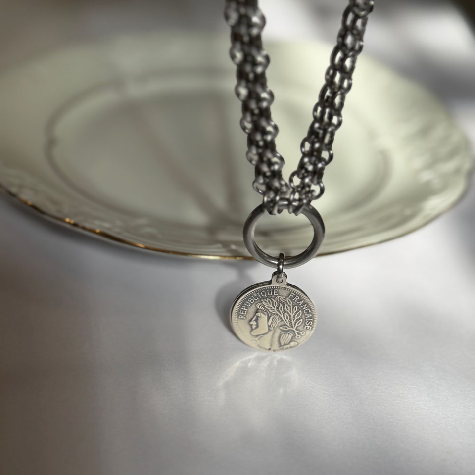 אני עונדת שרשרת לולאה מטבע גדול בגוון כסף