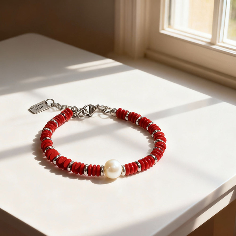 צמיד דיסקיות בגוון אדום עם פנינה גדולה