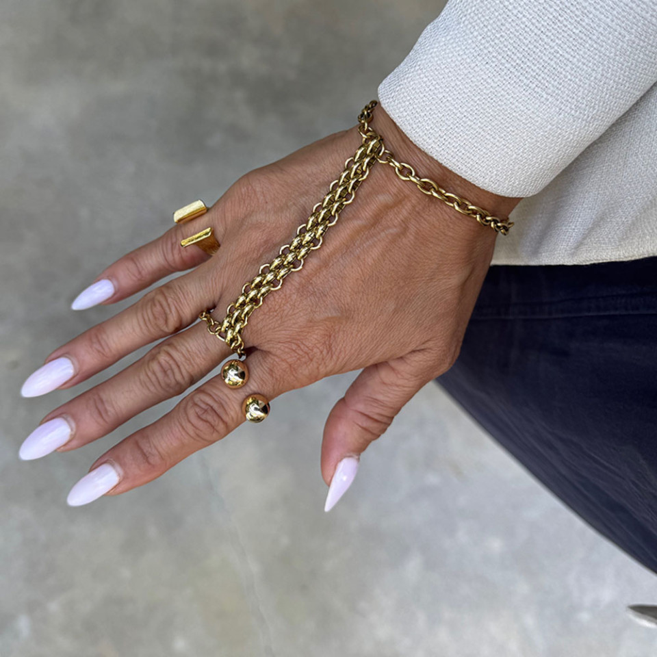 על יד שמאל אני עונדת את הצמיד טבעת המעוטר בציפוי זהב כמה הוא יפה