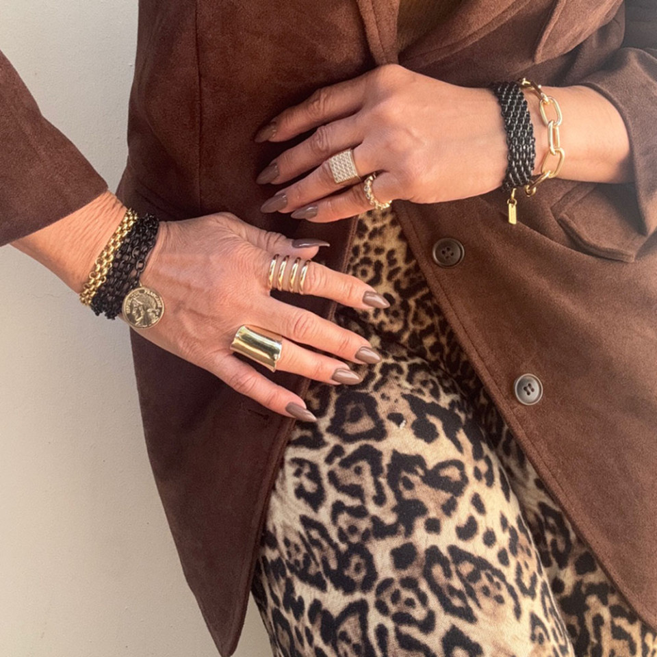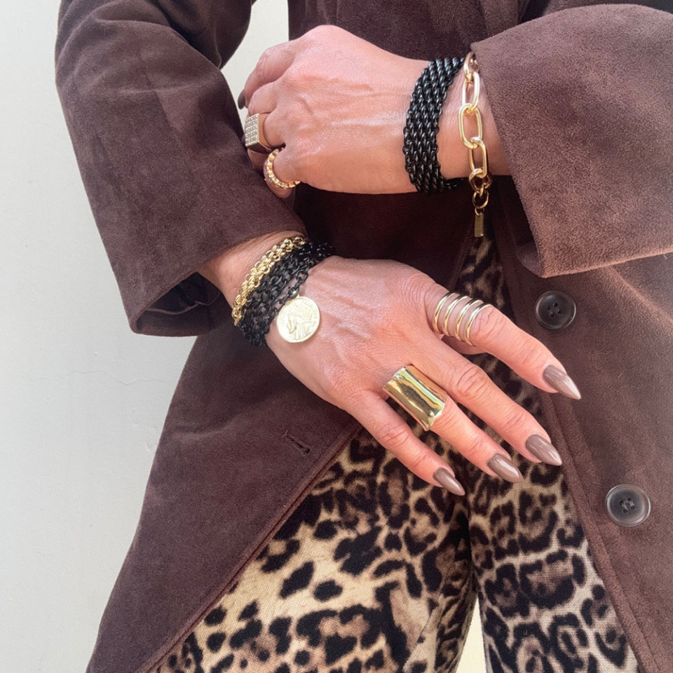 על יד שמאל אני עונדת את הצמיד אטבים אלומניום בציפוי זהב