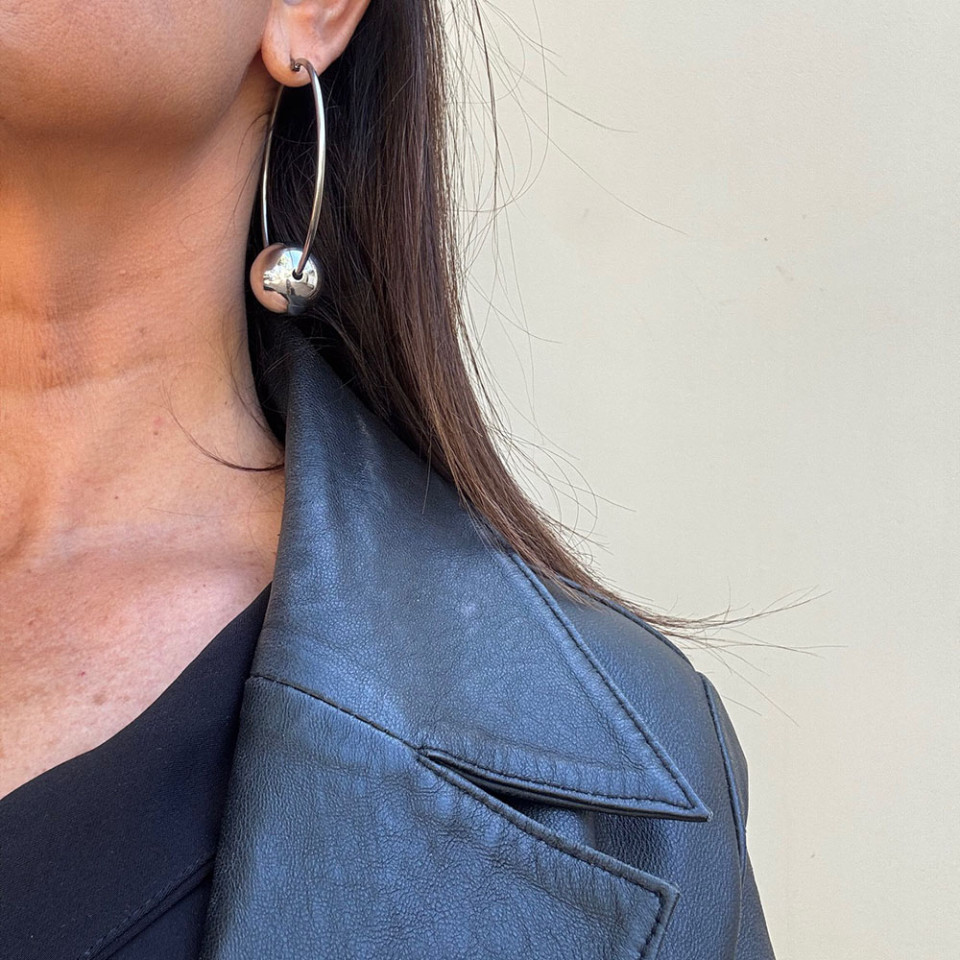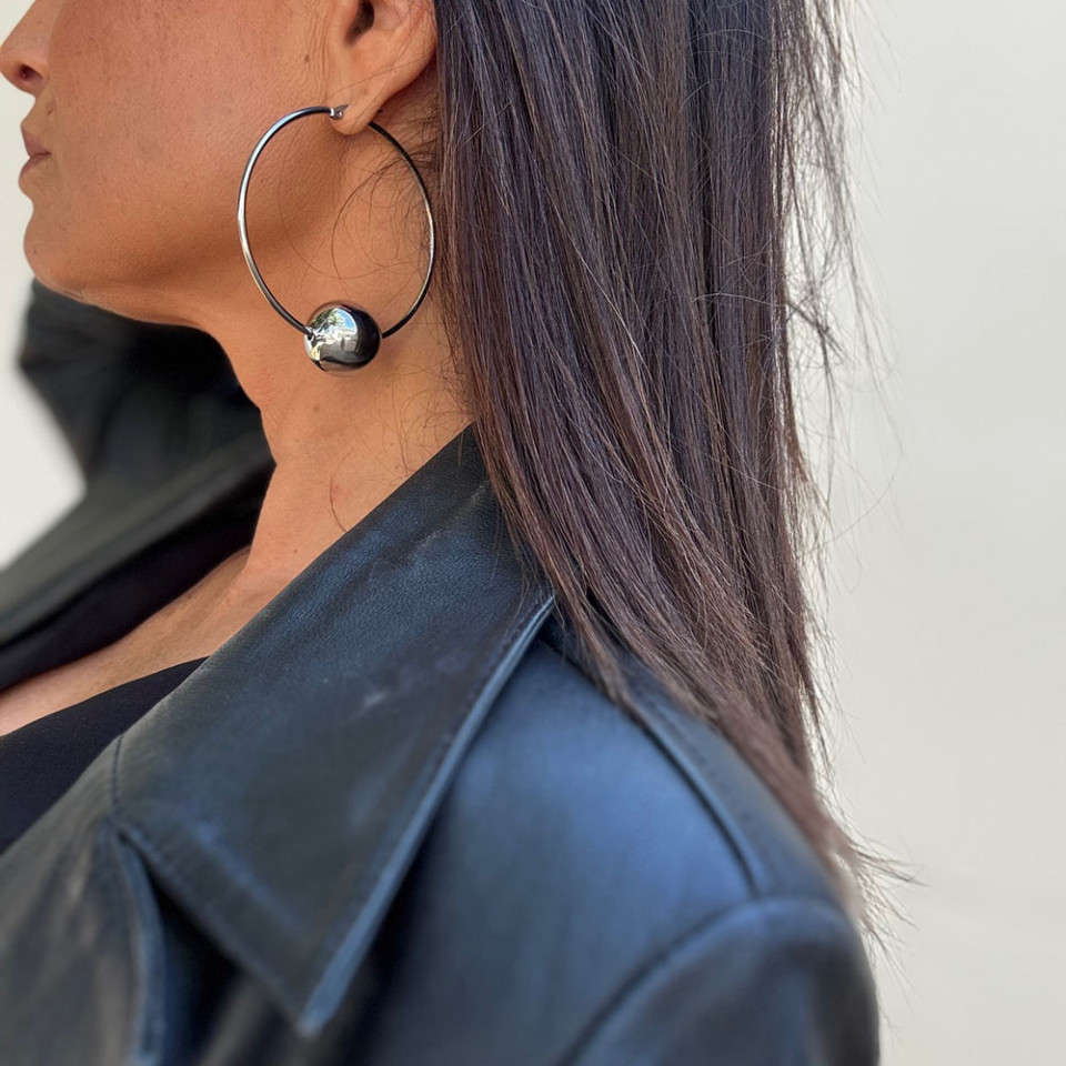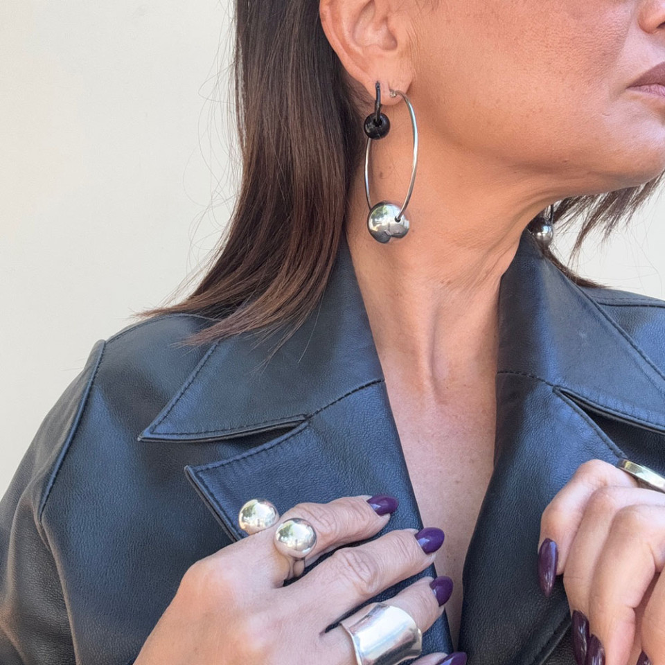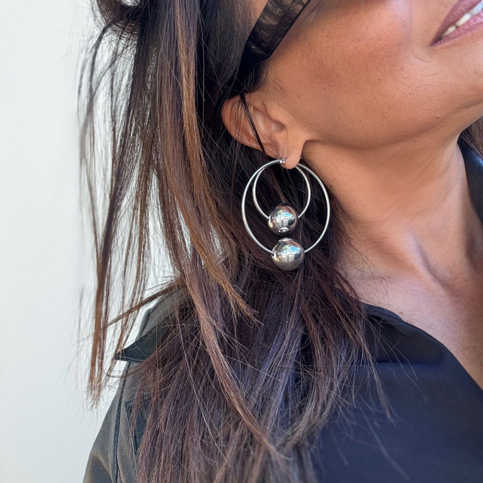 עגילי חישוק כדור ענק בכסוף עם כדור כסוף וכדור שחור