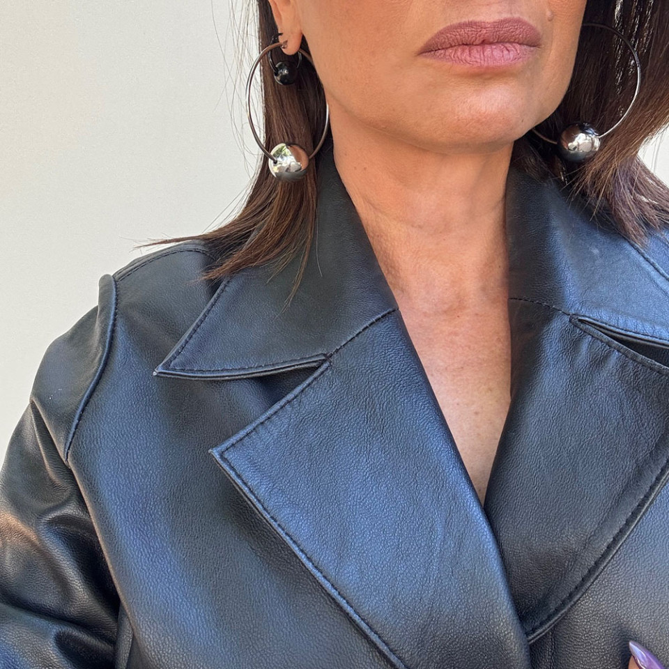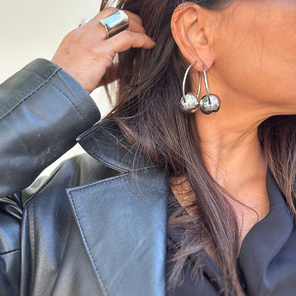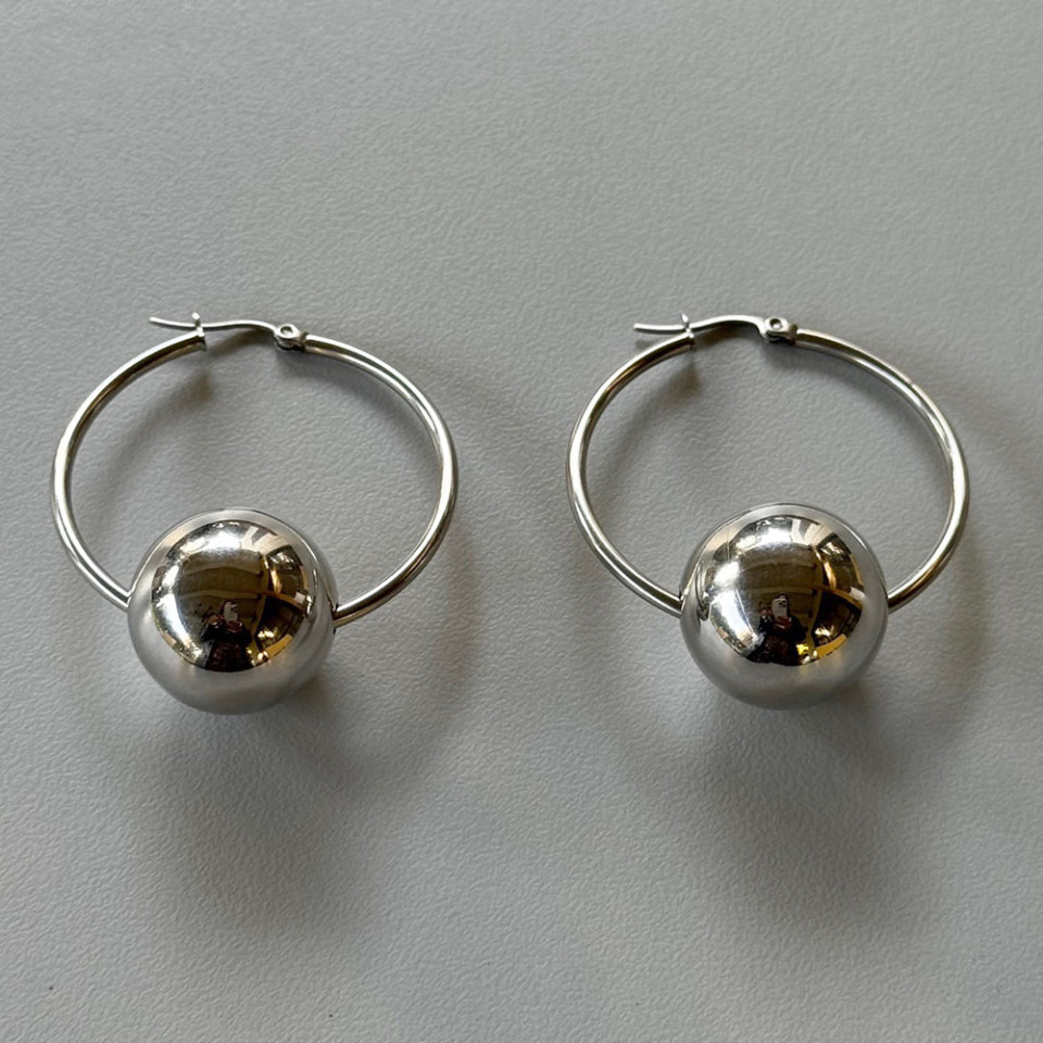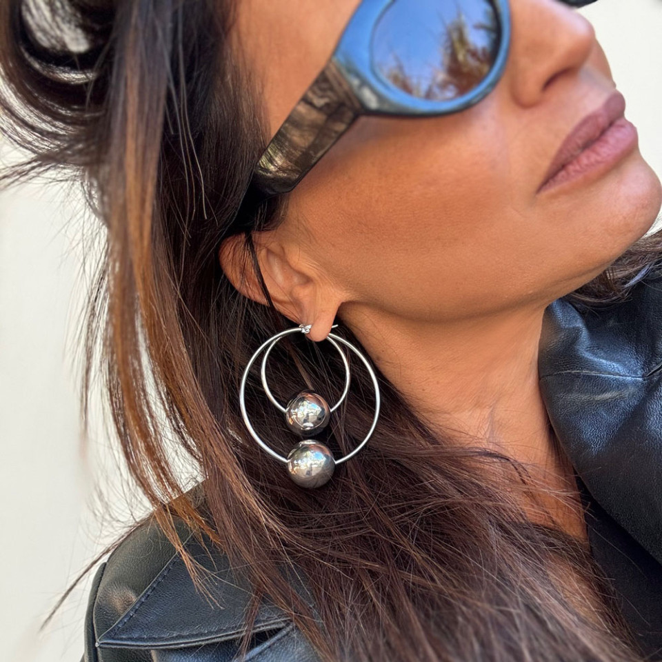עגילי חישוק כדור ענק בכסוף עם כדור כסוף וכדור שחור