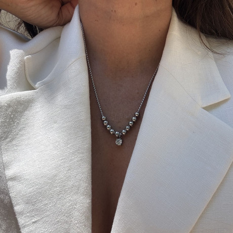אני עונדת שרשרת חרוזים וזירקון בגוון כסף