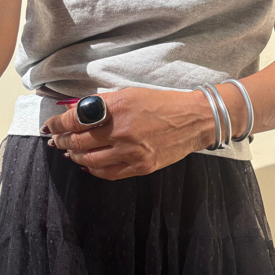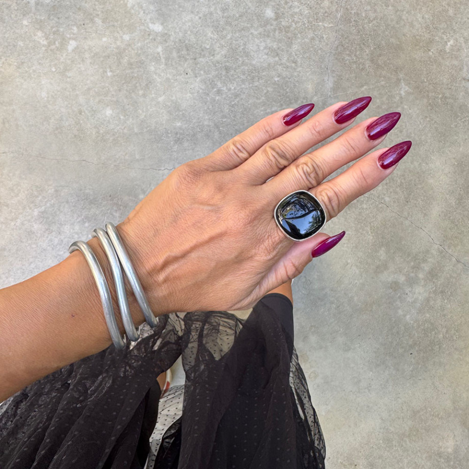 על האצבע אני עונדת טבעת מרובעת אוניקס כסף 925